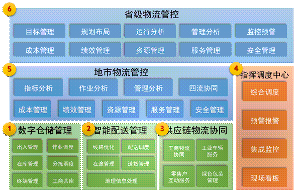 智能配送管理系统:与行业GIS公共服务平台结合可给予物流配送的线路优化、配送调度、在途管理以及送货管理等。系统给予基于GPS、3G技术等的车辆在途监控、客户到货确认与服务评价等功能,并给予移动端解决方案。